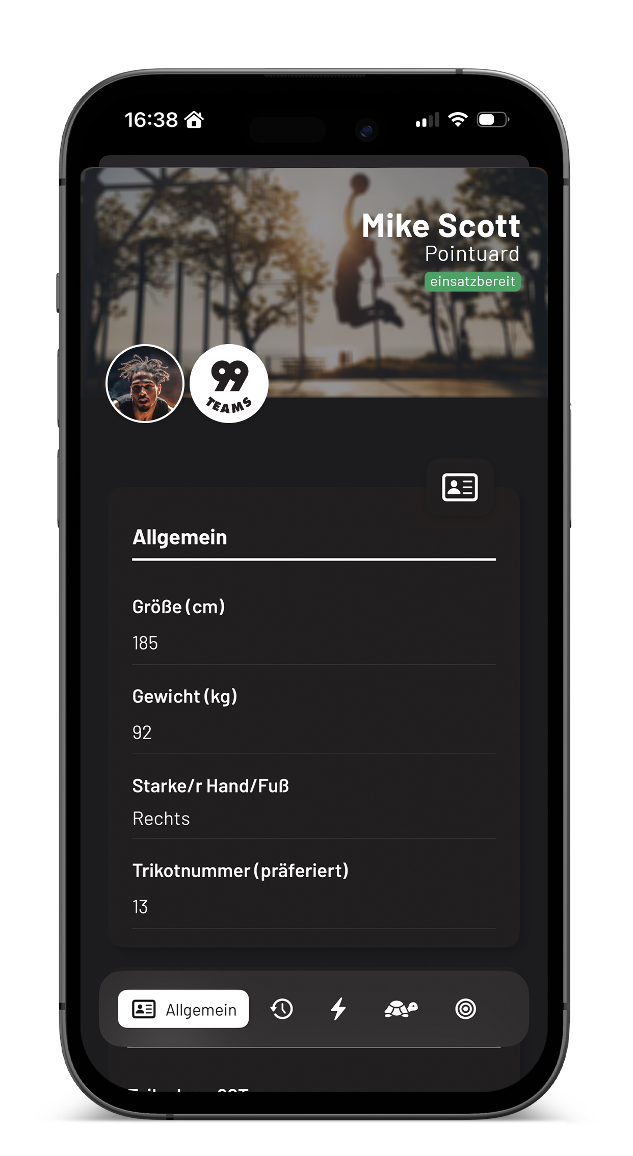 Die Spielerkarte bündelt alle wichtigen Infos zu jedem Spieler – von Kontaktdaten, Trikotnummer und Verfügbarkeit, bis zu Stärken, Schwächen und Zielen der Spieler – du hast als Trainer und Co-Trainer jederzeit den perfekten Überblick über die Spieler.