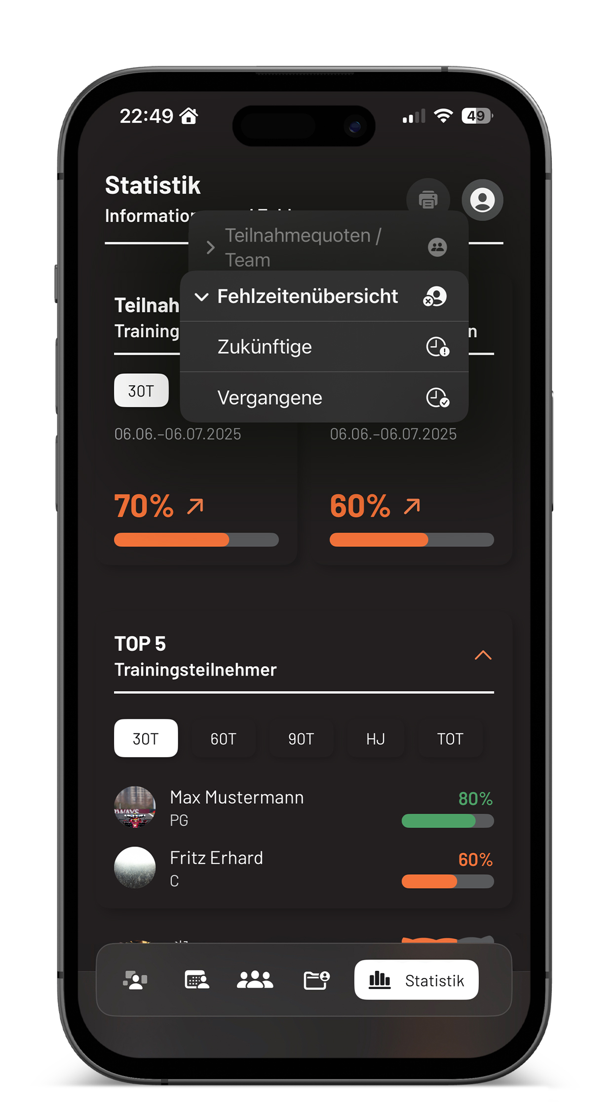 Die Statistikfunktion von 99TEAMS zeigt euch auf einen Blick umfangreiche Teilnahmequoten. Somit erkennst du als Trainer die Entwicklungen und kurzfristige Tendenzen, kannst optimal und rechtzeitig steuern.