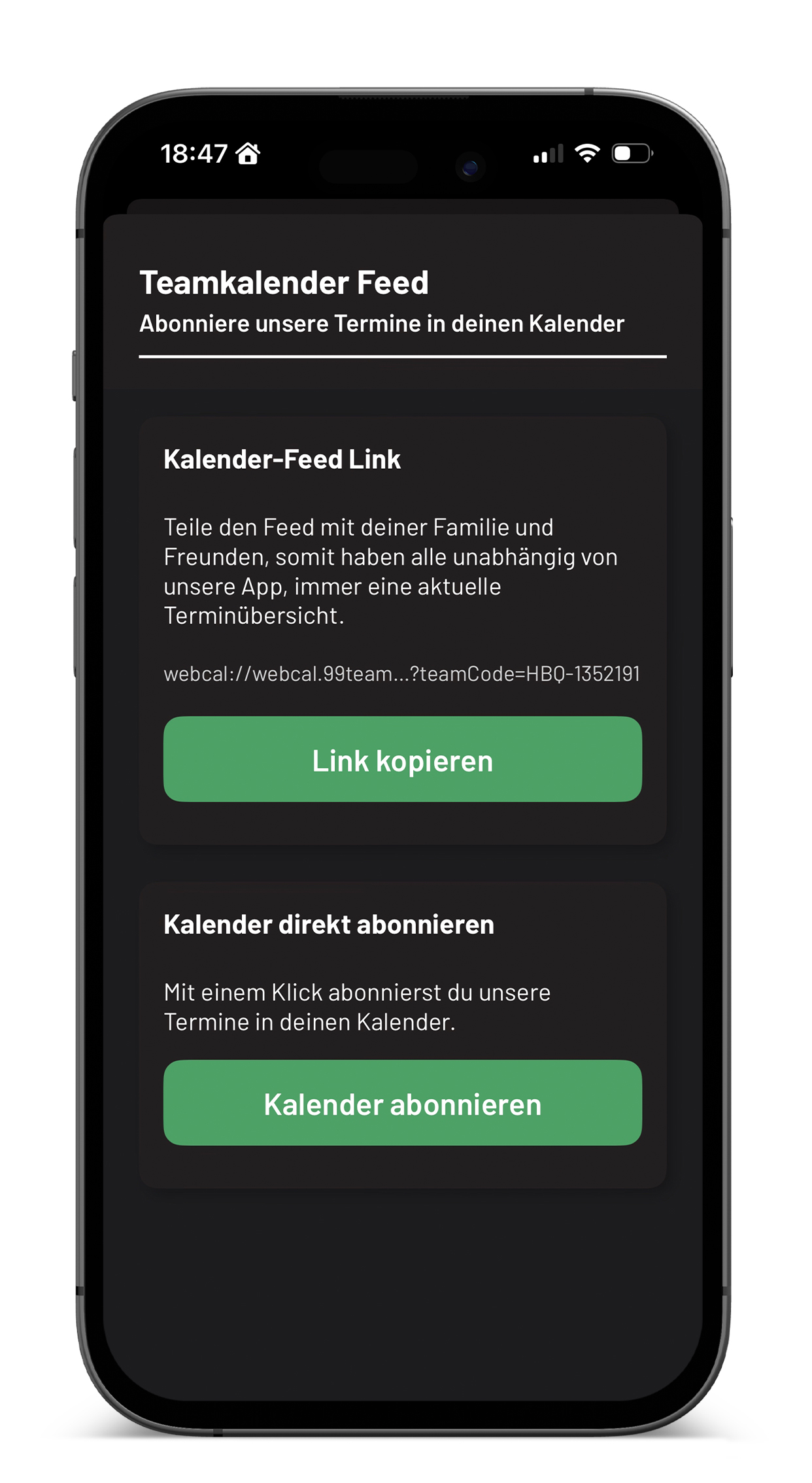 Abonniere den Teamkalender im Smartphone Kalender und teile diesen mit Freunden und deiner Familie, somit haben alle den aktuellsten Überblick deiner Termine innerhalb der Mannschaft.